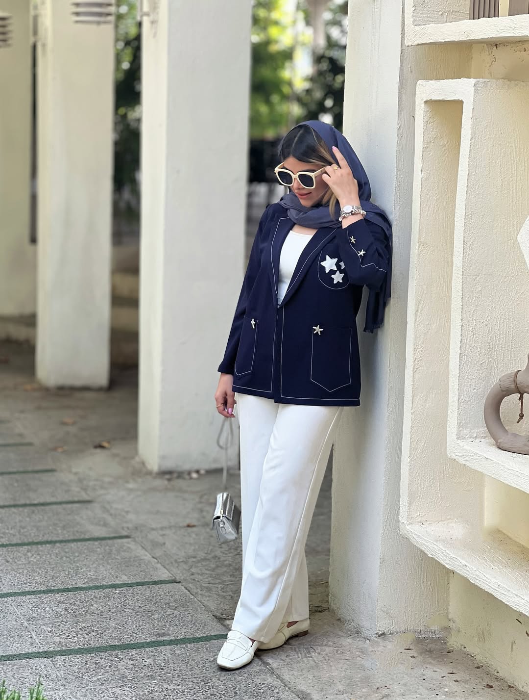 و ترکیب همیشه جذاب سورمه ای و سفید شد یک کت شیک ک هم میتونی اسپورت استایلش کنی هم رسمی بنظر من ک سورمه ای کتار سفید معرکس کت ستاره متریال کت کرپ لانوین قد کت از ۶۰تا ۸۰موجوده (قد کت تن مدل۷۰) کت ۱۲۹۰ (ستاره ها و جیب روی سینه امکان حذف شدن دارن) . شلوار کرپ باربی سایزبندی کت و شلوار از ۳۶تا۴۸موجود فروش حضوری و آنلاین مغازه:مشهد،پروما،طبقه دو ،پلاک ۲۷۳ و واتساپ #کتمشکی#کت_اسپرت#شلوارسفید #کتشلوارمجلسی#مانتو #کتشلواراسپرت#کت_سورمه_ای