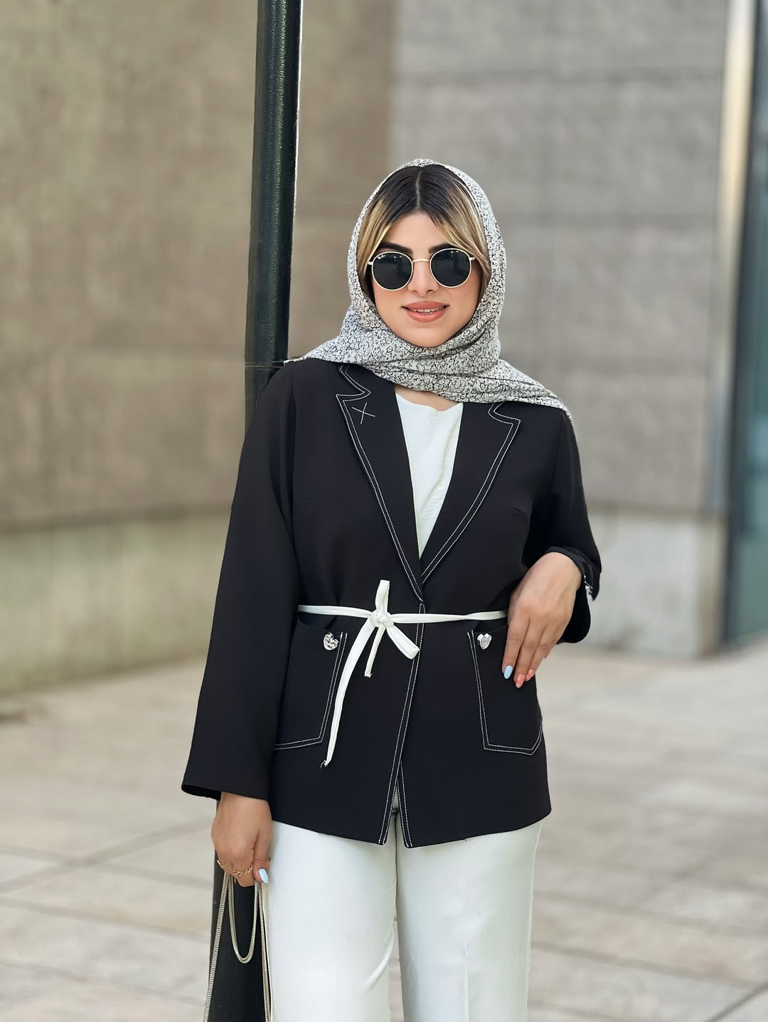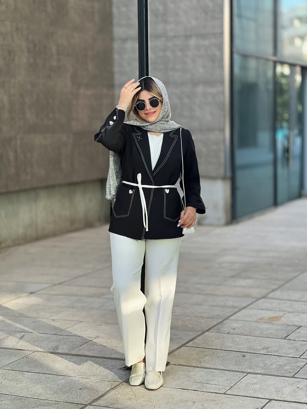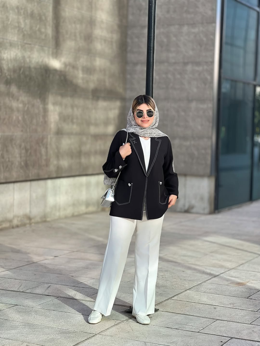و باز هم ترکیب همیشه جذاب سفید و مشکی شد یک کت مشکی ک هم میتونی اسپورت استایلش کنی هم رسمی کت لاو متریال کت کرپ کجراه قد کت از ۶۰تا ۸۰موجوده (قد کت تن مدل۷۰) کت ۱۲۹۰ شلوار کرپ باربی سایزبندی کت و شلوار از ۳۶تا۴۸موجود فروش حضوری و آنلاین مغازه:مشهد،پروما،طبقه دو ،پلاک ۲۷۳ و واتساپ #کتمشکی#کت_اسپرت#شلوارسفید #کتشلوارمجلسی#مانتو #کتشلوارمشکی